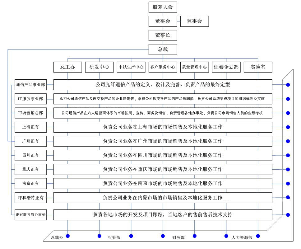 正有公司是由多家股东出资建立的股份制有限公司,公司的管理体制和运作方式完全依据《公司法》中关于股份制公司的规定。公司设立股东会和董事会,公司采用董事会领导下的总裁负责制,由总裁负责公司的日常运作与管理。 公司运用现代企业管理制度,具有完善的法人治理结构和管理的民主性与透明性,公司奉行“一切为了客户”的质量方针以及“树立高科技为本,规模产业报国”的企业宗旨。